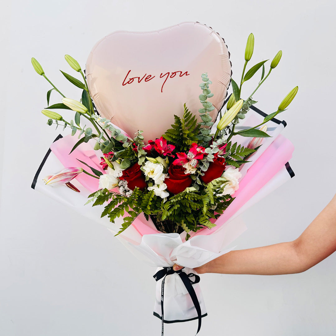 Ramo hand tied compuesto de astromelias, rosas rojas, lisianthus blancos y lilums, eucalipto silver, helecho cuero y lilium blanco. Acompañado de un globo en forma de corazón y finos papeles coreanos.